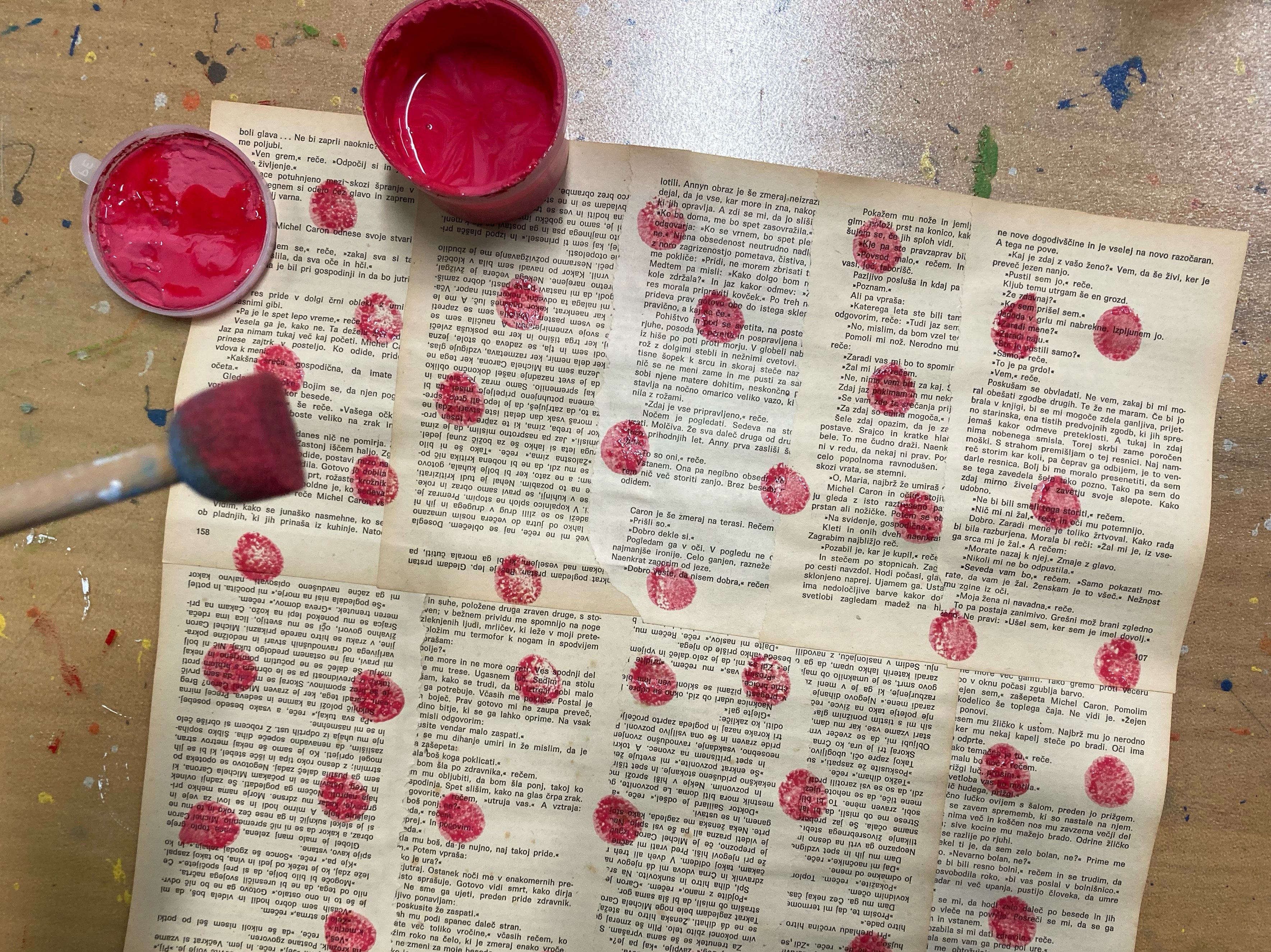 Darilni papir okrasimo tudi s spužvico, ki jo namočimo v barvo, in vzorce odtisnemo na papir.