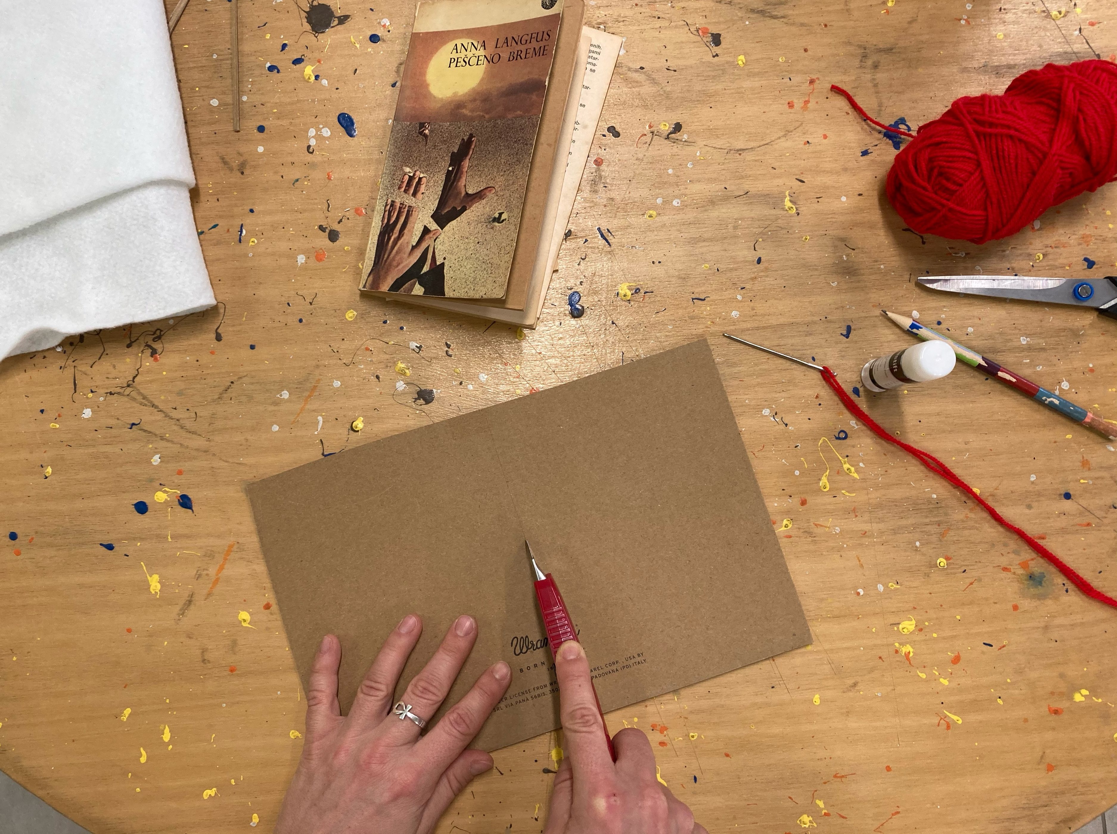 Zdaj, ko imamo zasnovo voščilnice, jo na sredini rahlo zarežemo z olfa nožem, da dobimo prepogib in tako dve strani čestitke: sprednjo in zadnjo. Zarežite res nežno, toliko, da karton poči in omogoči prepogibanje vaše voščilnice.
