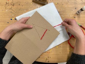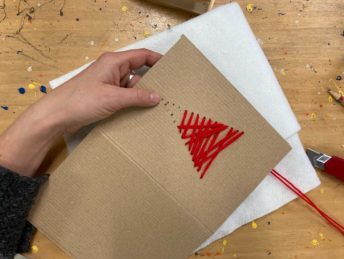 - sprednjo platnico voščilnice samo preluknjamo z iglo in z volno ali debelejšo nitjo “zašijemo” vzorec. To je lahko jelka, darilni paket, snežinka, zvezda, …